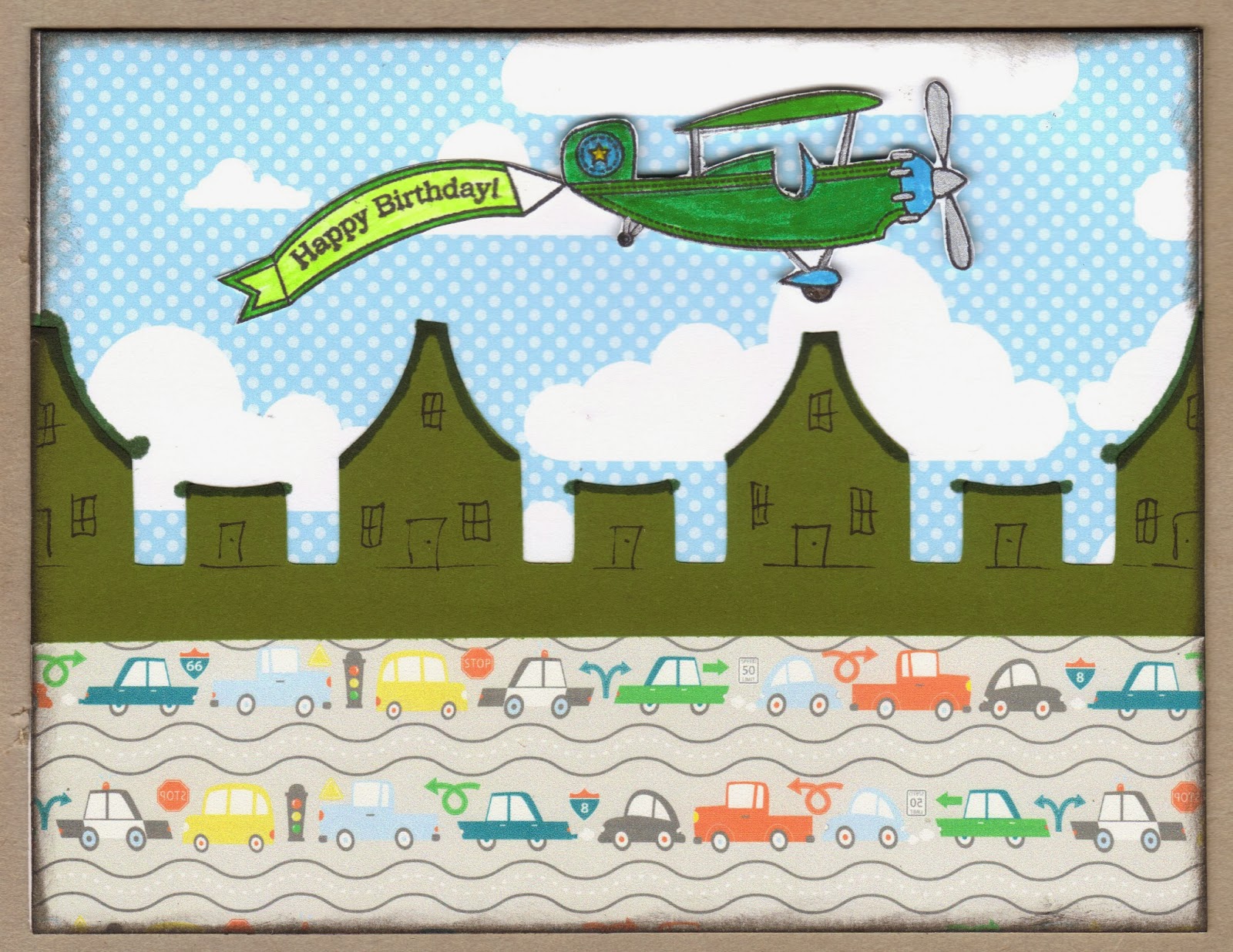The cute little plane and it's banner are from Papertrey Ink, one of my favorite stamp companies. The row of little green houses is the result of another Silhouette Cameo die-cut leftover. The background papers are more digital prints.